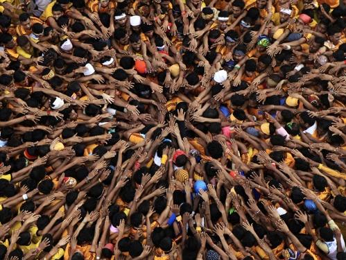 Indian youth make a human pyramid to reach and break the "Dahi Handi", an earthen pot filled with yogurt, as they celebrate Janamashtami, the birth anniversary of Hindu God Krishna in Mumbai, India.